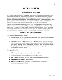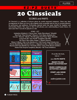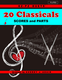 20 Classicals is a collection of diverse pieces by world renowned composers. These easy duet arrangements for flutes are true to the original works as possible and are sure to resonate pleasure for performers and audiences. Performing classical music has many benefits for beginner and intermediate flutists. One aspect is that it will advance your understanding of music theory. In most cases Part I can also be played as a solo.