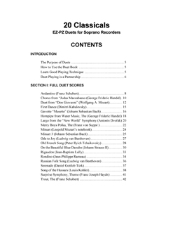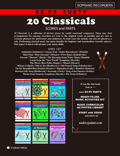 20 Classicals is a collection of diverse pieces by world renowned composers. These easy duet arrangements for soprano recorders are true to the original works as possible and are sure to resonate pleasure for performers and audiences. In most cases the melody can also be played as a solo. Performing classical music has many benefits for beginner and intermediate recorder players. One aspect is that it will advance your music skills.